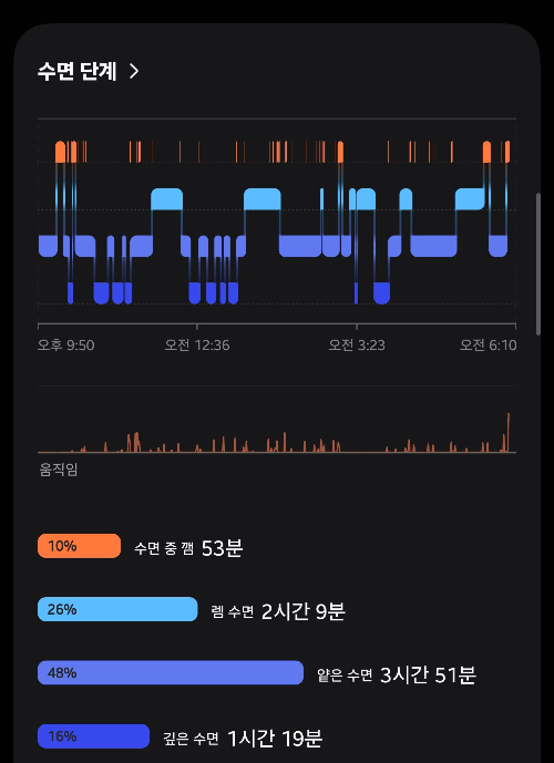 - 얕은 수면 : 가민 4시간 50분 / 갤워치 3시간 51분