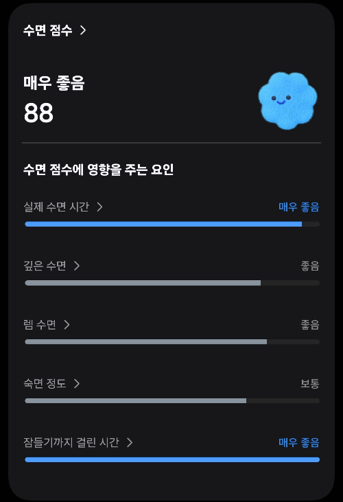 - 갤럭시 워치 : 수면 점수 88점(매우 좋음), 실제 수면 시간 7시간 19분