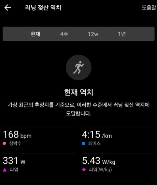 - 젖산역치: 4:15/km (168bpm 기준)