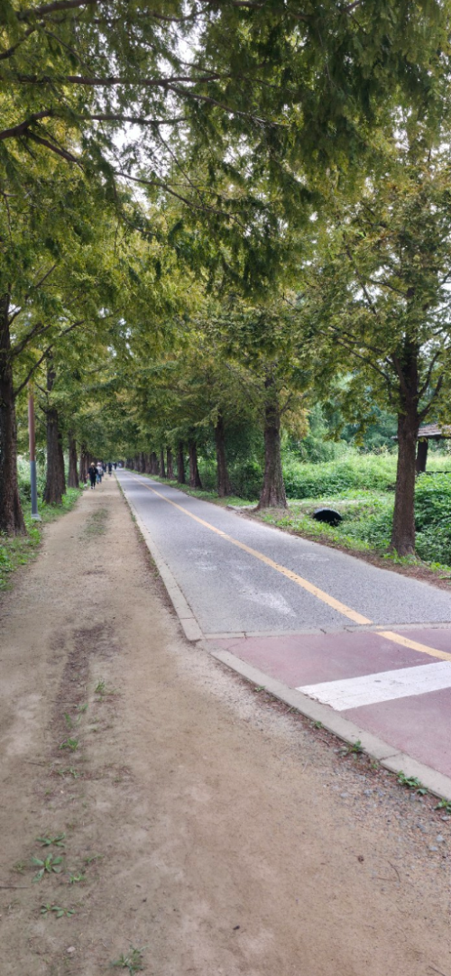 중반부에 접어들며 발길은 나무들 가로수 길로 이어졌습니다. 양옆으로 곧게 뻗은 나무들이 하늘을 향해 줄지어 서 있는 모습은 마치 초록빛 터널 속을 달리는 듯한 기분을 선사했습니다.