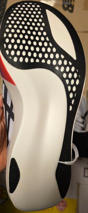 아웃솔이 얇아 내구성은 기대 이하입니다. 30km 트랙 러닝에서는 마모가 거의 없었지만, 실제 도로 풀코스를 여러 번 뛰게 되면 바닥이 빠르게 닳을 가능성이 큽니다. 대회 전용 러닝화라는 한계가 명확합니다.