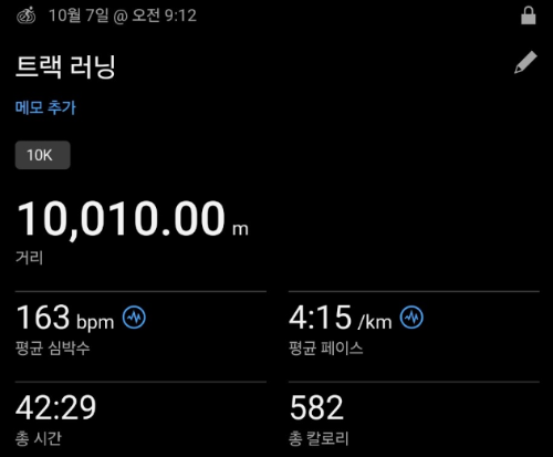 총 거리 10.01km / 평균 페이스 4:15 / 총 시간 42분29초 / 평균 심박 163bpm.
