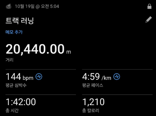 그리고 오늘은 새로운 장비, 가민 HRM600 심박계를 착용하고 트랙 러닝 20.4km를 진행했습니다.