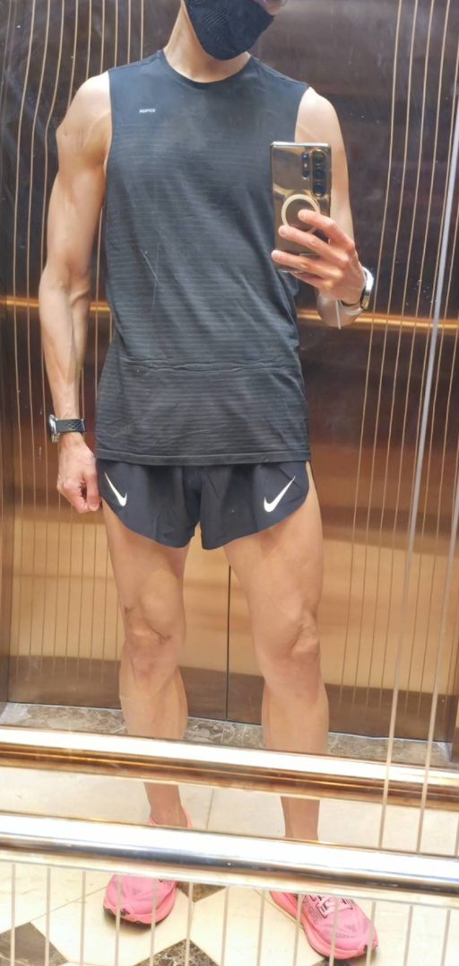 오늘은 깔끔한 회색 나시와 나이키 러닝 팬츠로 코디했어요. 야간 러닝이라 화려할 필요도 없고, 편안함이 최우선이죠! 거울 속 모습을 보니 '아, 나도 제법 러너 같아 보이네?' 하는 생각이 들었어요. 😎