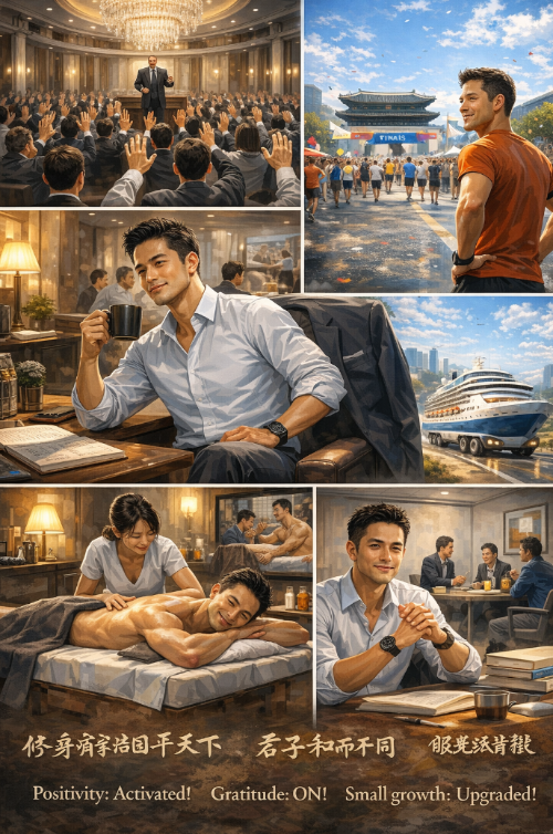 현실의 회사와 닮았지만, 그 공간은 마치 최고급 호텔 연회장처럼 동그랗고 거대한 홀 구조였고, 백색 인테리어에 샹들리에 조명이 반짝이고 있었습니다. 그 중심에는 한국 특정 대기업 기준으로 치면 부문장급쯤 되어 보이는 아주 높은 리더가 서 있었고, 수백 명의 직원들이 창가 쪽을 바라본 채 두 팔을 머리 위로 들어 올리고 있었습니다.