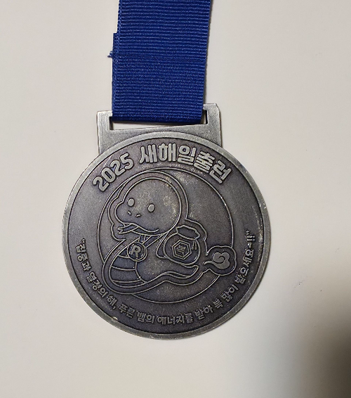 메달 속 귀여운 캐릭터 디자인은 2025년이라는 뱀의 해를 형상화한 것 같은데, 새해의 기운과 러너들의 열정이 고스란히 담겨 있어요. 이 메달은 바로 그런 새해의 의지와 기운이 담긴 증표입니다.