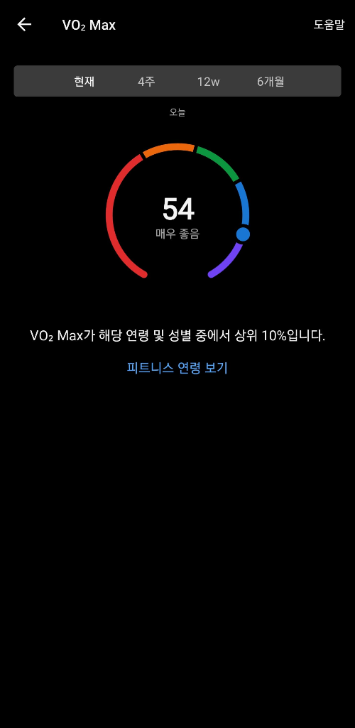 Garmin에서 측정된 제 VO₂ Max 수치는 54로, 해당 연령대 및 성별 중에서 상위 10%에 해당한다고 합니다. VO₂ Max는 우리 몸이 운동할 때 최대로 사용할 수 있는 산소량을 나타내는 지표로, 심폐지구력과 전반적인 체력 수준을 보여주는 중요한 데이터예요.