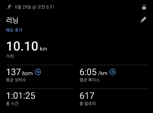 일요일 오전 6시 11분, 주말의 마지막 러닝이었습니다. 10.10km를 평균 페이스 6분 5초로 달렸고, 평균 심박수는 137bpm이었어요. 1시간 1분 25초 동안 617칼로리를 소모하며, 한 주를 정리하는 시간을 가졌습니다.