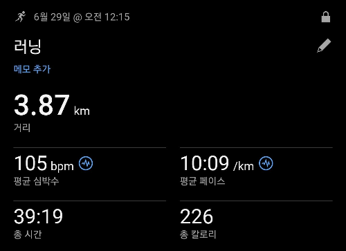 토요일 밤에서 일요일 새벽으로 넘어가는 시간, 아내와 함께한 부부 러닝은 완전히 다른 의미였습니다. 평균 페이스 10분 9초로 천천히, 대화를 나누며 39분간 3.87km를 함께 걷뛰 했어요. 평균 심박수도 105bpm으로 편안했고, 226칼로리를 소모했습니다.