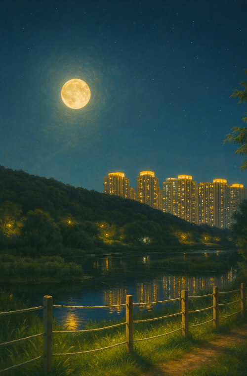 - 특징: 호수에 비친 아파트 불빛과 달빛의 조화
